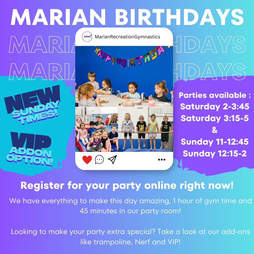 Have the best birthday ever at Marian! We have Birthday spots, Saturdays and Sundays with Add-ons available to make it a super Marian birthday!
